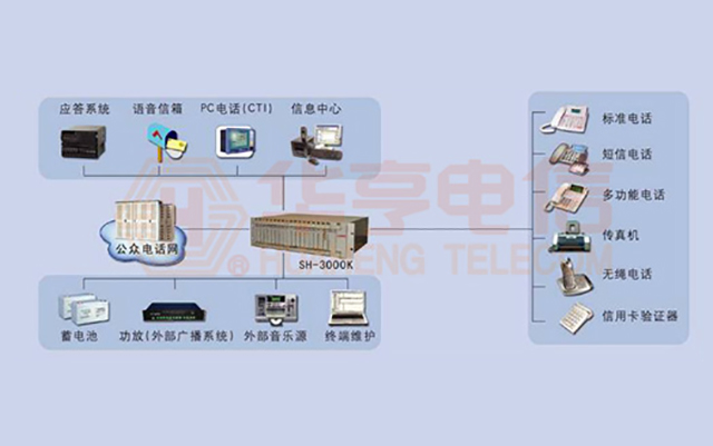SH-3000K數字程控交換機所有的用戶能兼容連接普通電話機、來電顯示電話機、傳真機、華亨專用多功能電話機等各種終端。更換各種終端無須更換交換機的軟硬件配置,交換機自動識別不同的終端用戶。